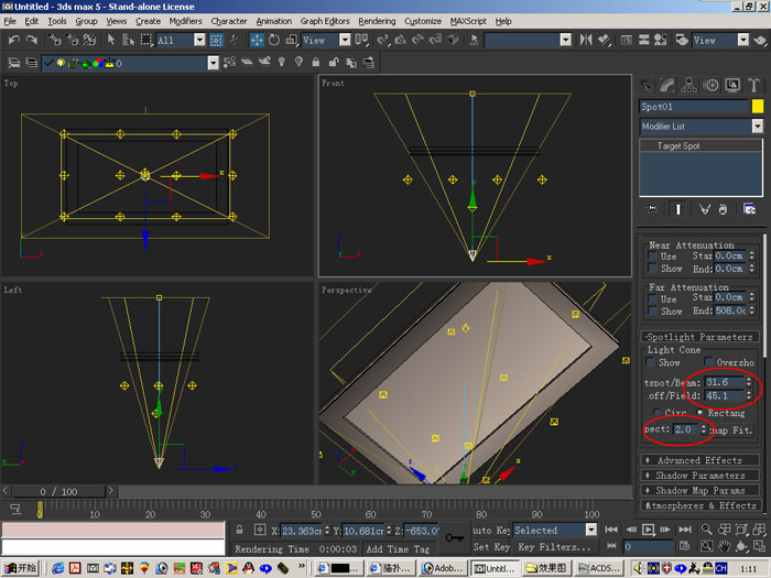 這盞燈的亮度也根據場景的需要來調整。 接下來調整“...pect”這個值 (我的max字體問題還沒有去解決他,大家看圖) 使負光區(qū)域與燈槽形狀能夠符合。 再調整控制燈光擴散的那兩個值(看圖.....), 使其有自然的過渡。然后就調整好光源原點的位置, 使其能夠將負光投射到box物體上的正確位置。