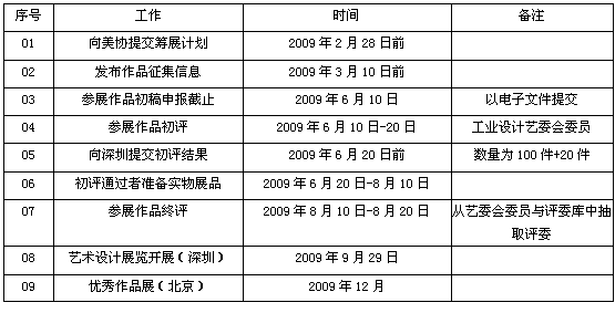 一、展覽信息發(fā)布 在2009年3月中旬以前中國美協(xié)藝術(shù)設(shè)計范圍內(nèi)的各專業(yè)委員會將聯(lián)合或者分別向本專業(yè)媒體以及全社會發(fā)布征集作品信息,與此同時也請各藝委會委員動員有實力的設(shè)計師積極參賽。