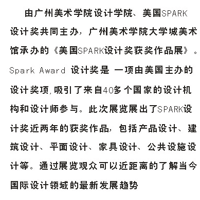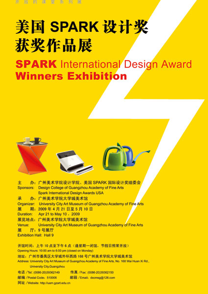 展覽主題: 美國(guó)SPARK設(shè)計(jì)獎(jiǎng)獲獎(jiǎng)作品展 主 辦: 廣州美術(shù)學(xué)院設(shè)計(jì)學(xué)院、美國(guó)SPARK國(guó)際設(shè)計(jì)獎(jiǎng)組委會(huì) 承 辦: 廣州美術(shù)學(xué)院大學(xué)城美術(shù)館 展 期: 2009年4月21日至5月10日 展覽地點(diǎn): 廣州美術(shù)學(xué)院大學(xué)城美術(shù)館 展 廳: 9號(hào)展廳 前 言: SPARK設(shè)計(jì)獎(jiǎng)是一個(gè)全新的獎(jiǎng)項(xiàng)——一個(gè)設(shè)計(jì)上的交叉點(diǎn),在這里所有的參與者不論來(lái)自任何領(lǐng)域,他們的關(guān)注點(diǎn)都得到了肯定和傳達(dá)。SPARK 設(shè)計(jì)獎(jiǎng)授予那些代表了未來(lái)新價(jià)值觀的杰出的產(chǎn)品,包括建筑、平面以及家具設(shè)計(jì)等作品。這些獎(jiǎng)項(xiàng)由來(lái)自全世界40多個(gè)國(guó)家的設(shè)計(jì)師和設(shè)計(jì)機(jī)構(gòu)分享,其中既有國(guó)際著名的設(shè)計(jì)師和公司,如James Dyson,Smart Design等,也不乏具有豐富創(chuàng)造力的年輕學(xué)生;SPARK 設(shè)計(jì)獎(jiǎng)超越了20世紀(jì)中以來(lái)形成的設(shè)計(jì)觀, 在當(dāng)今世界,怎樣讓最好的創(chuàng)意和設(shè)計(jì)得到贊許?SPARK設(shè)計(jì)獎(jiǎng)褒獎(jiǎng)設(shè)計(jì)領(lǐng)域的杰出人士, 但我們也需要一個(gè)平臺(tái)讓那些出色的平凡設(shè)計(jì)師得到發(fā)揮,使我們所處的世界參與到設(shè)計(jì)中來(lái)——讓我們把那些優(yōu)秀的生活塑造者展示給世界。