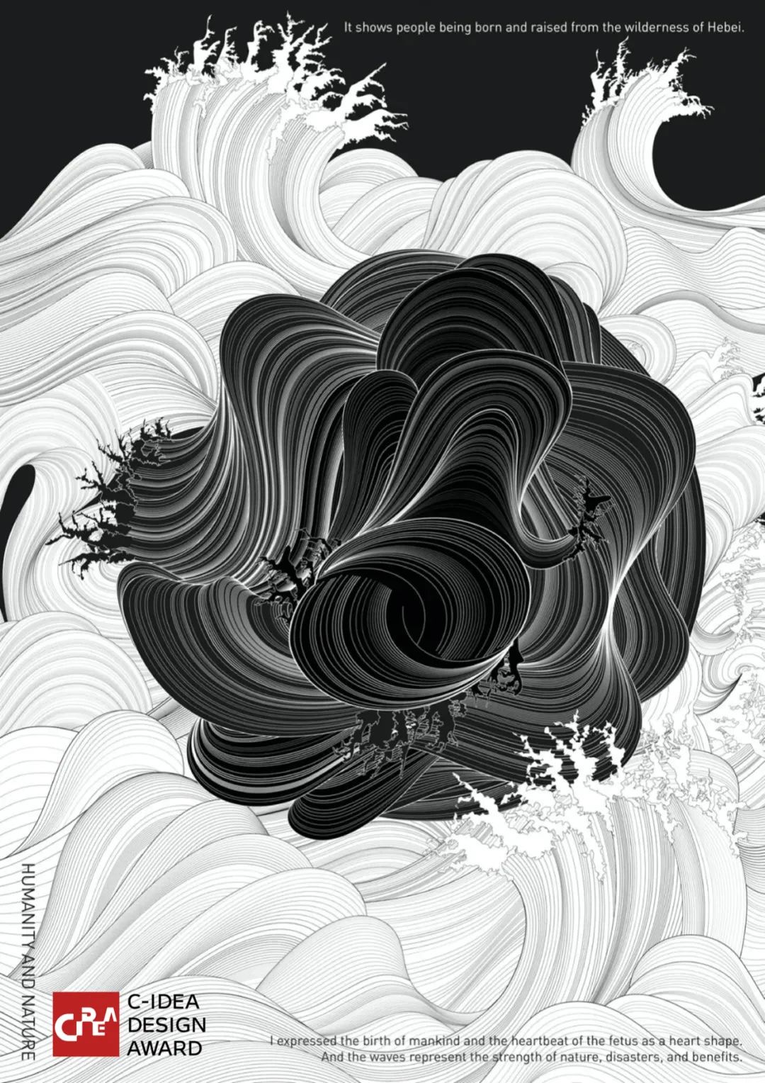 該作品是以“Humanity and Nature/人類與自然”為主題創(chuàng)作的海報(bào)作品,其展示了在中國河北這片土地上出生和長大的人們;在作品中用心形來表達(dá)人類的誕生和胎兒的心跳。與此同時(shí),海浪代表了自然和災(zāi)害的力量,以及壯麗的河北風(fēng)光。