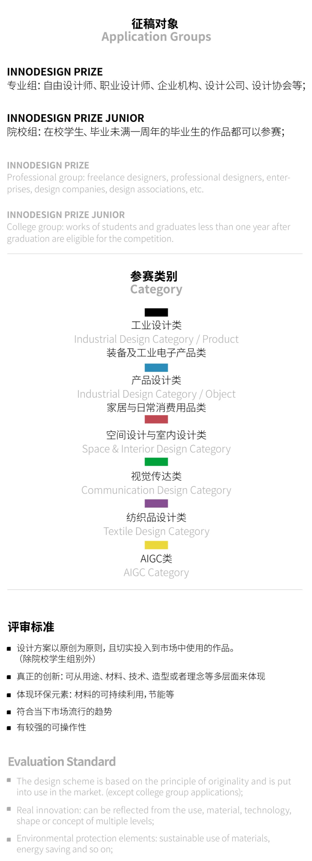 關(guān)于大賽更多詳細(xì)信息,可瀏覽大賽中方官網(wǎng): http://www.innodesignglobal.com/ 如有疑問,INNODESIGN PRIZE可添加大賽官方微信 INNODESIGN_CN 咨詢;INNO AIGC設(shè)計(jì)獎(jiǎng)可添加官方微信 INNOAIGC 咨詢。