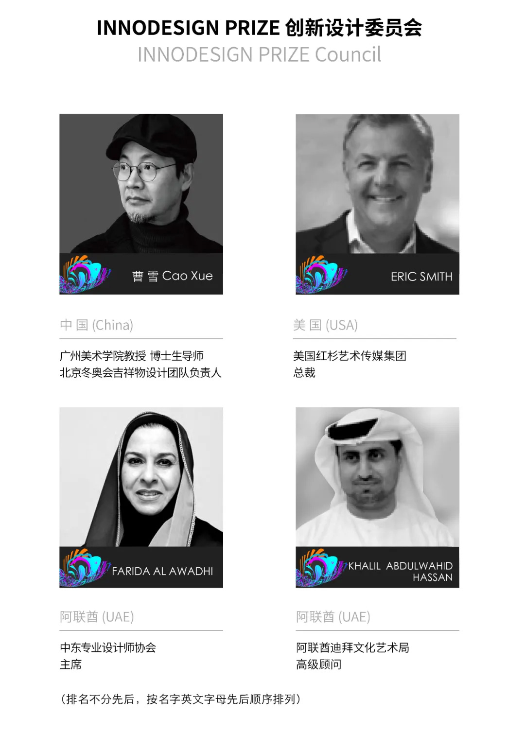 學(xué)術(shù)支持 ·INNODESIGN PRIZE亞太區(qū)學(xué)術(shù)委員會(huì) ·中東(迪拜)專業(yè)室內(nèi)設(shè)計(jì)師協(xié)會(huì) ·美國(guó)大學(xué)迪拜分校 ·美國(guó)紅杉傳媒集團(tuán) ·INNDA 創(chuàng)設(shè)會(huì)