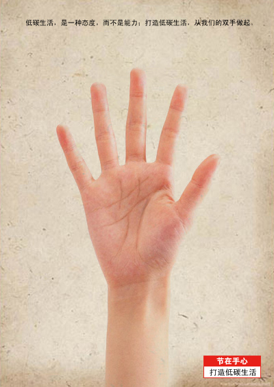 簡(jiǎn)介: 海報(bào)將掌紋和漢字“節(jié)”巧妙的結(jié)合在一起,與觀眾引起共鳴:低碳生活,是一種態(tài)度,而不是能力;打造低碳生活,從我們的雙手做起。