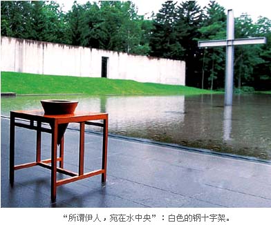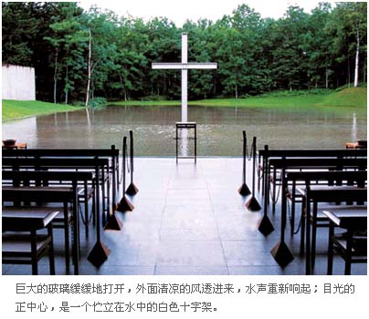 好像是一霎那,就轉身進入了教堂的大廳,眼前一亮。三面實墻的大廳里,有一整面墻消失了,代之一塊巨大的玻璃,透露了外面所有的景色,青天、碧水、綠樹;目光的正中心,是一個佇立在水中央的白色十字架。我正發(fā)呆,突然背后出來一個人,幾乎嚇了我一跳。原來是教堂管理員,他告訴我,這里一般只用來舉辦婚禮儀式,平時沒什么人來。為了展示婚禮時的效果,他按動墻上的按鈕,那面巨大的玻璃緩緩地打開。外面清涼的風透進來,水聲重新響起。我不由自主地向水邊靠近,有一種需要屏住呼吸的感覺!八^伊人,在水一方”,眼前的情景,和中國古人描述的意境,有某種驚人的相似。凝視著遠處的十字架,我感到夢幻一樣的沖動:如果這時有人握住你的手問“愿意和我度過終生嗎”,誰能拒絕說“我愿意”?