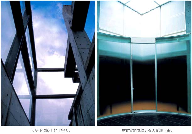 當眼前驟然呈現(xiàn)出一片光亮安寧的水面,剛才還尋尋覓覓的我心里發(fā)出了驀然回首的感慨:人們一直尋找的寧靜,只不過是這山林里無人問津的寂寞。我面對的,是一個長方型的水池,里面的水很淺,緩緩地流著。水池盡頭,兀自立著那個著名的教堂。要進去,必須沿著水池長長的一側走過,聽著水發(fā)出輕輕的聲音,看著水面淡淡的漣漪。這是一個從現(xiàn)實到非現(xiàn)實的過程:穿過建筑側面不起眼的入口,先上臺階,再往下走,逐漸昏暗,人也逐漸沉靜。水聲沒有了,人影更是不在,只有腳步敲打光滑的水泥地面的聲音;在昏暗和空洞的腳步聲里,油然期待那方才的光亮。