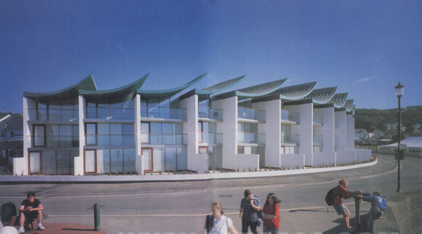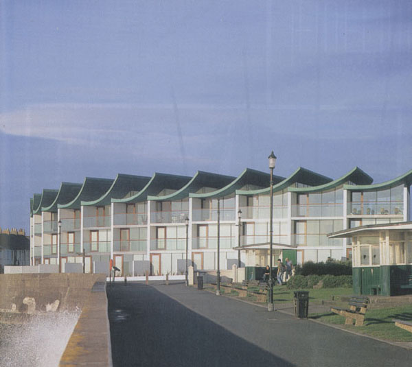 這座新月形的建筑內包含有28間公寓,它沿著街道的半徑展開,軸線由南北向轉為東西向,弧線中央一條假想的垂直軸線準確地指向海面,使建筑的主體直面大西洋。從整個建筑到內部公寓布置的尺度都由場地的幾何構圖所決定,每個單元都順著地勢成臺階形與其周圍的單元相接,形成一種復雜的非標準尺度。沒有兩個單元是完全相同的,弧形南端的房間更接近于矩形,越靠近建筑東側的房間發(fā)生的傾斜越大,豐富了建筑的空間感受。底層的單臥室房和上部的雙臥室房共用走廊,為了適應短時使用的需要,建筑流線簡短緊湊,入口空間被安放在楔形平面較窄的一側,以使起居室獲得最大的尺度,起居室外面向海面的一側擁有自己的獨立平臺和陽臺。空間的比例由于兩側墻的放大分離而被夸張了,并在端部以不易使人察覺的落地玻璃結束,平臺和陽臺成為了起居空間的自然室外延伸。為了對抗大西洋的海洋腐蝕性氣候,屋頂和側墻采用鋼框架內填充塊材,飄浮的屋頂仿佛騰空的風箏。二層的起居室通過曲形拱腹上的南向天窗獲得采光。