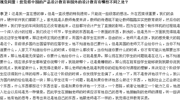 李衛(wèi):如果我沒有理解錯的話,你的觀點呢就是社會需要一些有用的人才,在上學(xué)的時候越早讓他們變得有用,出去以后好找工作,我的觀點跟這確實不一樣。社會發(fā)展的速度越來越快,我自己體會,十年以前我學(xué)的東西,還不到十年的時間,就已經(jīng)覺得我必須充電,現(xiàn)在我學(xué)完了以后回來,又感覺我學(xué)的東西又不是新的,現(xiàn)在的速度是五年,那么你院校培養(yǎng)的那些技術(shù),除了形式上的那些東西以外,都是落后,我的感覺就是,今天老師培養(yǎng)的,就是落后,所以學(xué)生必須具有自主學(xué)習(xí)能力的技巧,現(xiàn)在我覺得問題關(guān)鍵是社會招人有一些單位招的是技術(shù)型人才,中國現(xiàn)在還不太需要設(shè)計型人才,因為他是抄嘛,看誰抄的快,做的快,那么在這個階段來講的話我們沒辦法評價教育跟他的關(guān)系,那么現(xiàn)在很多企業(yè)包括國家都呼喚創(chuàng)新,那么今后培養(yǎng)的學(xué)生,應(yīng)該符合時代需要。但是無論哪個時代都有不同的人才的需要,就是比如說我現(xiàn)在能夠理解同樣是工業(yè)設(shè)計,技校、中專、大專、本科、碩士、博士、博士后,那么現(xiàn)在我們很多本科院校培養(yǎng)的其實在一定意義上是大專的甚至是中專的這種層次。他是技能教育,那么本科教育,至少美院不應(yīng)該這么作,這不是什么高低的問題,是從其他的角度去探索一些特色不同層次之間需求。另外一點我覺得如果有可能的話,我建議如果這個學(xué)生不是基于家長的要求和自己出于對學(xué)習(xí)的留戀,本科畢業(yè)以后別直接讀碩士。工作幾年,再根據(jù)這個行業(yè)和自身的情況來決定是否繼續(xù)深造。