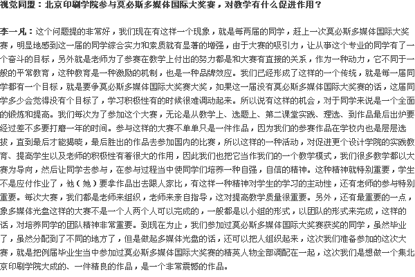 視覺同盟:北京印刷學(xué)院多次在莫必斯多媒體國(guó)際大獎(jiǎng)賽中獲獎(jiǎng),請(qǐng)您談一談這方面的情況?