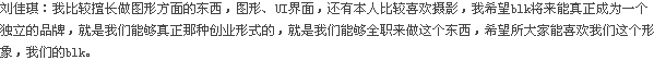 鮑宏斌:我擅長(zhǎng)的是像創(chuàng)意、畫插畫,還有各種他們不愛干的雜事,都是我干,我希望blk能成為國(guó)內(nèi)的一個(gè)更好的動(dòng)漫品牌,希望國(guó)內(nèi)的品牌不要老被韓國(guó)、美國(guó)市場(chǎng)充斥,我希望中國(guó)也能做出自己的動(dòng)漫品牌,我希望所有關(guān)注blk的朋友,希望他們能多提寶貴意見,我們會(huì)根據(jù)大家提出的一些建議,做出修改,盡快把blk網(wǎng)站更快地更新。