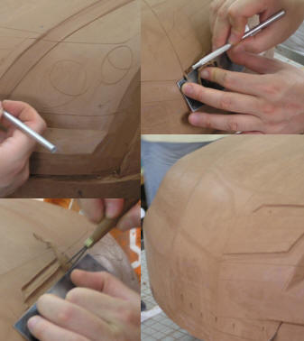 做造型:前臉進(jìn)行深入設(shè)計(jì),并將刮片作尺,用刮刀刮削散熱器格柵的造型。