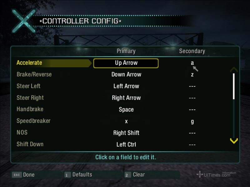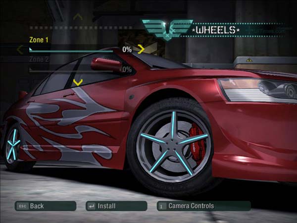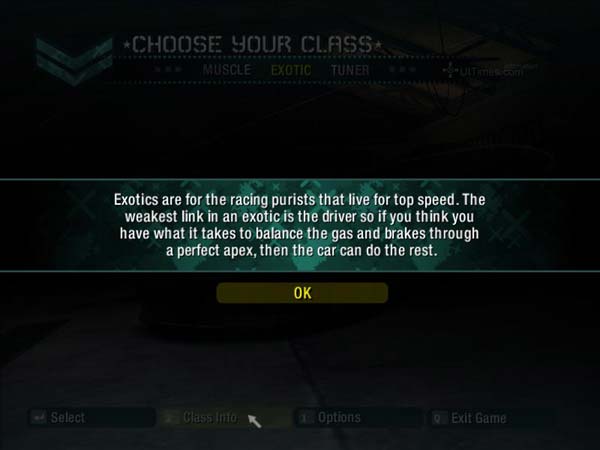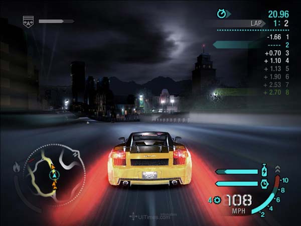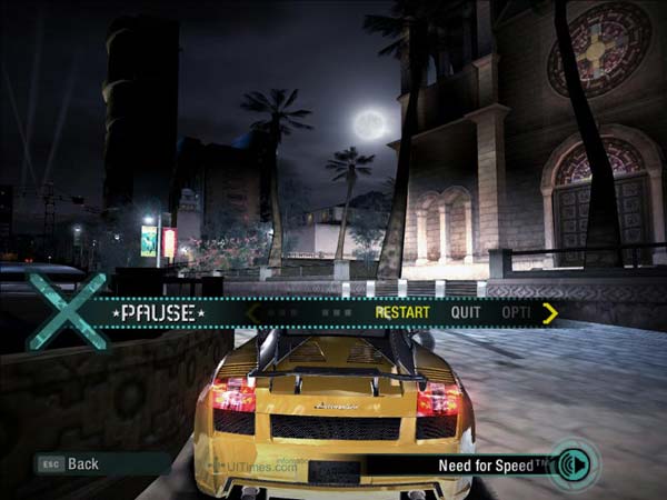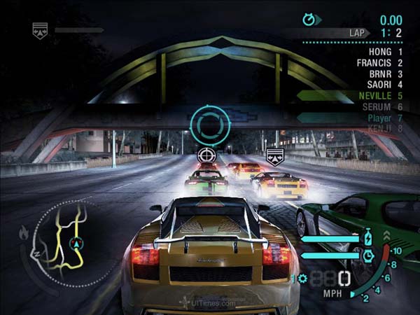 試玩只提供了3輛可選車輛。默認是一輛很漂亮的蘭博基尼。這個版本的NFS界面主色調(diào)是灰綠色,靈魂圖標是一個小十字。你可以在各個細節(jié)的地方看到它。
