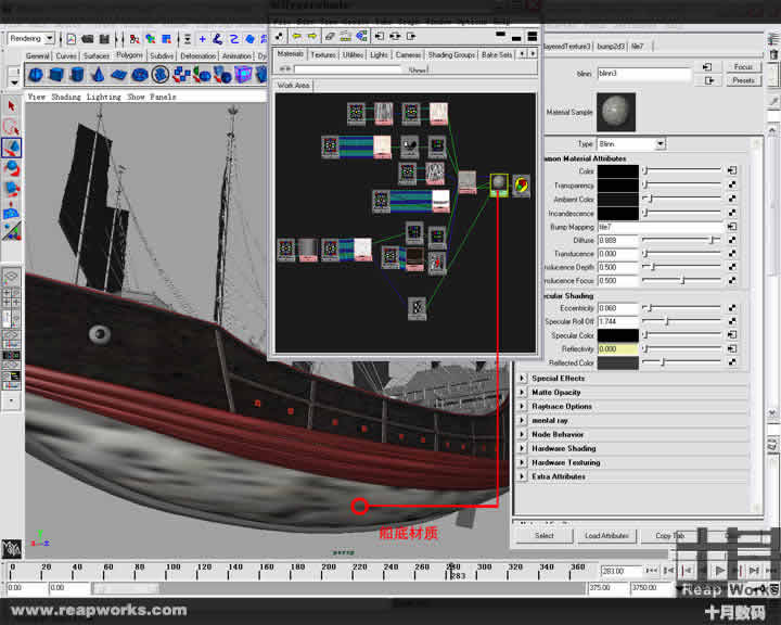 船帆的用到了layer shader,通過多層紋理的疊加來達到逼真自然的效果。因為船帆上會有一些油漬、污漬,所以通過多層的紋理疊加,達到逼真、自然的感覺。我認(rèn)為在材質(zhì)這一部分,更偏重與感覺上的的東西,主要考驗的是制作人員的美術(shù)功底,其實其中涉及的技術(shù)問題并不是特別的多,平時多留心觀察大自然,注意周圍身邊的事物。對紋理創(chuàng)作是絕對有幫助的,其實這也算是一種素材的積累。當(dāng)觀察紋理的時候盡量把它們分成color、diffuse、specular、bump、reflect.通道,這樣對理解紋理是相當(dāng)有幫助的。