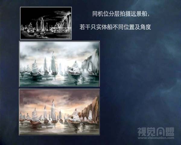 視覺同盟:您如何看待現(xiàn)在國內(nèi)電影特效的制作現(xiàn)狀和發(fā)展前景? 劉曉清:這個話題我要多講一點,因為這個話題比較大,我算是第一批在國內(nèi)做影視包裝的人,包括電視臺的節(jié)目包裝、欄目包裝、影視劇包裝,比如像《焦點訪談》欄目的演播室、中央人民電視臺的改版等等都是我曾參與的,還有很多,我從節(jié)目包裝到欄目包裝,到頻道包裝、影視劇包裝,從電影美術(shù)師到電視欄目包裝,這是需要一個過程的。其實從電視欄目包裝的角度來講,它跟電影特效還不太一樣,因為它的構(gòu)架和電影的語言是不一樣的。電影特效的語言要幫助電影敘事,包裝不需要敘事,它只需要一個形式、色彩,跟內(nèi)容要求差不多就行了。影視特效要圍繞某一個電影或者某一個電視劇所設定的故事去設定它的鏡頭和效果,創(chuàng)作一些在電視和電影中無法去拍攝到或者體現(xiàn)出來的鏡頭效果,它跟包裝區(qū)別是很大的,包裝不需要去追求真實性,我只要好看就行了,電影電視劇不行,電影電視劇至少在特效方面要求是不露痕跡的,里面的鏡頭是觀眾用肉眼看不出來的,是通過我們設計師、制作師完成的。比如說電視劇《喬家大院》,里面有很多鏡頭將就是這樣,里面究竟哪些鏡頭是做的,哪些是拍的,所以這種觀眾都不知道,還有比如《東歸英雄》、《大明王朝》、《暗算》,觀眾也看不出來,還有后面做的軍事題材的《士兵突擊》,觀眾一般是看不出來,但是里面有大量的鏡頭是通過特技來完成的。 我也是第一批的中國做影視特技的人,那時做得更多的是廣告,當時我們最擔心、最頭疼的就是計算機專業(yè)畢業(yè)的學生來學動畫、做CG、做特技……這是一個非常大的問題,因為會出現(xiàn)“和劇組融合不到一塊的”問題,導演想要什么,設計師想要什么,攝影師想要什么,美術(shù)師想要什么,不知道,完全憑猜,就是因為兩者的溝通很困難,大家的思維是不一樣的,專業(yè)性不一樣,學計算機的人是邏輯性思維,搞藝術(shù)的人是曲線性思維。不過現(xiàn)在情況好多了,因為通過電影學院這幾年的培養(yǎng),一批批的既懂技術(shù)又懂影視的學生出去以后,能夠跟導演溝通,導演想要的很快就能夠?qū)崿F(xiàn),可以通過分鏡頭畫面等方式進行溝通,現(xiàn)在技術(shù)現(xiàn)狀比以前好多了,有很大的進步,我們通過國內(nèi)的一些電視臺的廣告和電視劇、電影可以看到這個變化還是很大的,做得越來越好了,有些效果在過去這是不可想象的,最近我去臺灣講學,臺灣的幾個大學的學生看了我們的學生作業(yè),都非常驚訝,覺得我們的學生作業(yè)能做成這樣,他們都不可思議,在日本,這方面他們也不如我們,從教學的角度來講也不如我們,他們在制作觀念和手段比較落后,從這塊講,國內(nèi)還是有長足的進步,我們也看到了希望。