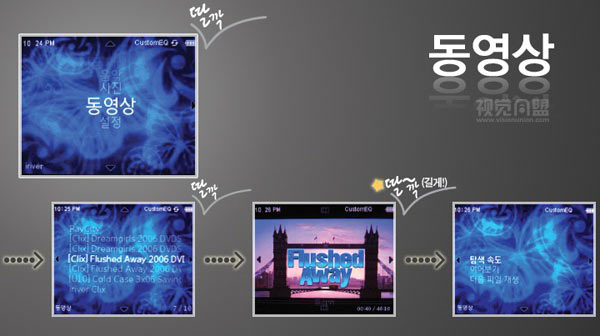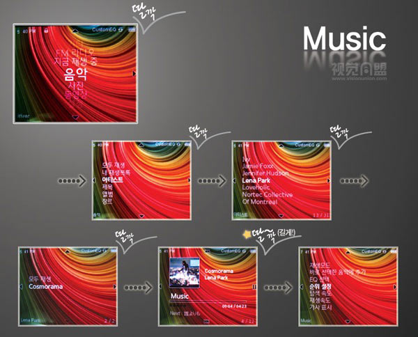 播放歌曲的流程,通過屏幕四周的四個方向鍵進入,也是這款產(chǎn)品所有的UI操作方式,一些關鍵的操作也被根據(jù)用戶習慣等活化到其中