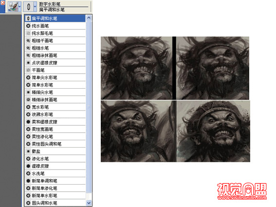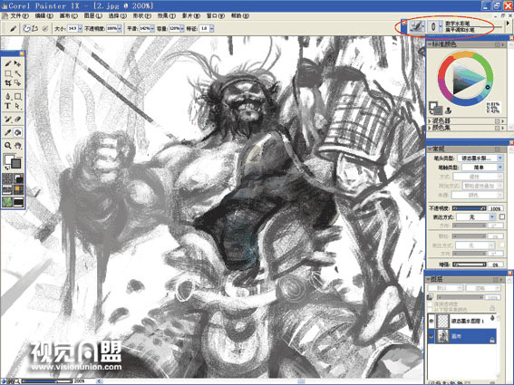 1:做任何事情,把開始的準(zhǔn)備工作規(guī)劃好是最重要的,畫畫、創(chuàng)作也一樣,要有良好的作畫習(xí)慣。一般我會(huì)將種種構(gòu)思的草圖都繪制出來。剛開始我還是按習(xí)慣在Painter里用鉛筆繪制了3張不同感覺的構(gòu)圖,至于構(gòu)思草圖的精細(xì)度,還是依個(gè)人的習(xí)慣和喜好來定。最后我選擇了圖中右邊標(biāo)有3的構(gòu)思圖。感覺這張想法在體現(xiàn)張飛的氣勢上會(huì)更充分些。
