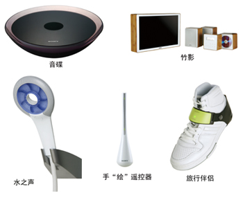 本次“索尼學生設計工作坊”的作品是: 最佳能量娛樂獎:手“繪”遙控器(Conductor ),東華大學,曹思文 最佳節(jié)能獎:音碟(Solar Speaker):江南大學,孫曉帆 最佳能量轉換獎:旅行伴侶(Green Walker):同濟大學,郭思凡 最佳能量循環(huán)獎:竹影(Bamboo Frame):浙江大學,邱懿武 最佳能量傳遞獎:水之聲(Bathman):東華大學,彭詩楠 2009索尼學生設計工作坊作品介紹
