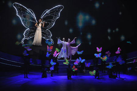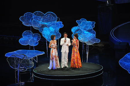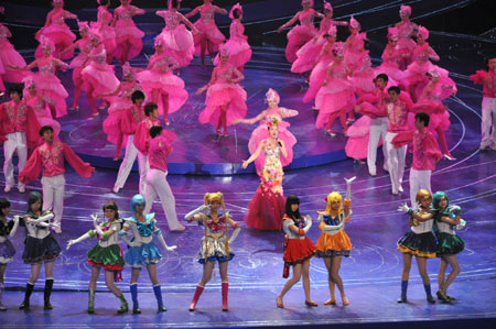 舞臺設(shè)計(jì)是非常夢幻的。1000多平方米舞臺是斜面的,在燈光的映射下,整個(gè)畫面將呈現(xiàn)出立體效果。舞臺上方懸掛著3個(gè)超大高精度的LED屏,每一個(gè)節(jié)目上演,都有不同主題的影像不斷播放。更為神奇的是,整個(gè)舞臺效果也是不斷變化的,在燈光的設(shè)計(jì)下,時(shí)而變成一張笑臉,迎接八方來客,時(shí)而插上一雙天使的翅膀,帶領(lǐng)觀眾在動漫世界里翱翔。