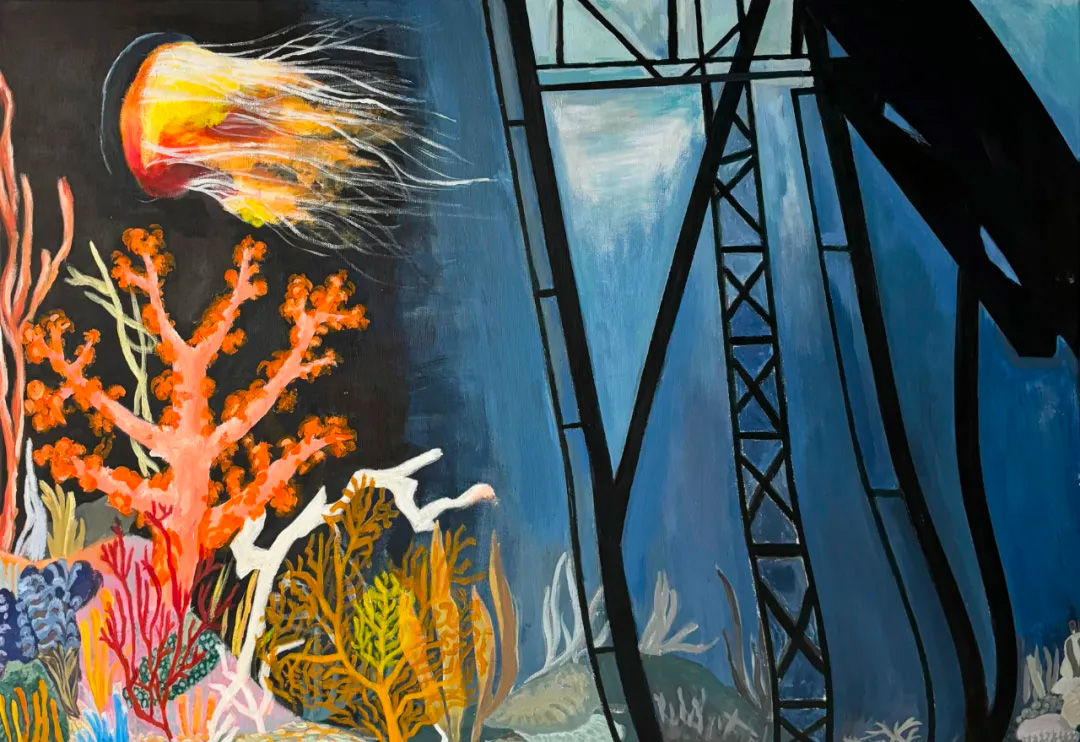 石油鉆探對深海生態(tài)系統(tǒng),尤其是珊瑚礁造成了重大破壞。為了說明這個(gè)概念,我在右邊描繪了一個(gè)深海石油鉆井平臺(tái),并使用了主要的灰色調(diào)色板來表示受污染的海洋區(qū)域。另一邊,我用明亮的顏色描繪了未受污染影響的原始深海珊瑚生態(tài)系統(tǒng)。通過這種對比,我的目的是提高觀眾的意識(shí),敦促他們保護(hù)深海環(huán)境……人類對深海珊瑚的破壞可能不是一個(gè)眾所周知或不為人所知的問題,所以通過這項(xiàng)工作,我想提醒人類不要進(jìn)一步破壞深海環(huán)境。