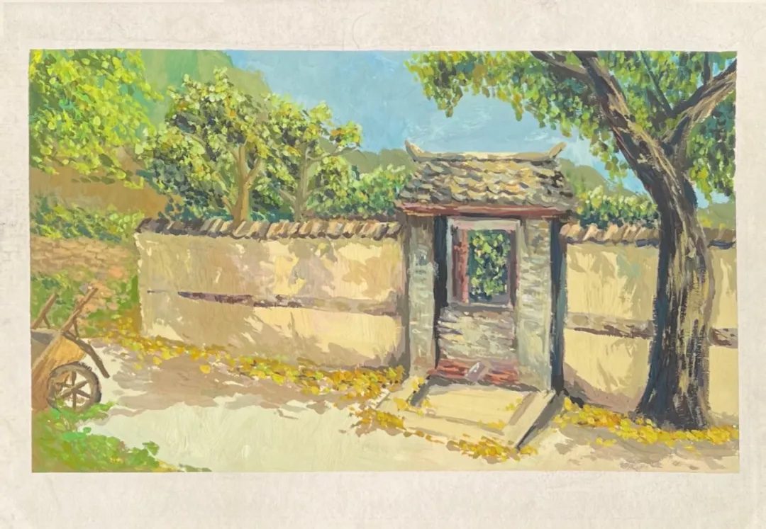 我前往北京平谷的某個(gè)鄉(xiāng)村寫生,被石堆封起的門,廢棄的木輪車,浮灰的磚瓦,無不訴說著這里已經(jīng)長久無人居住的事實(shí),但現(xiàn)在,這個(gè)事實(shí)也逐漸消失了,也許不久的將來取而代之的會(huì)是一片曠野,或是高樓大廈,但再不可能存在曾經(jīng)那戶人家樸實(shí)無華的生活痕跡了,我便將這場景記錄下來,那日的陽光分外燦爛,碧空如洗,也許恰是樂景襯哀情。