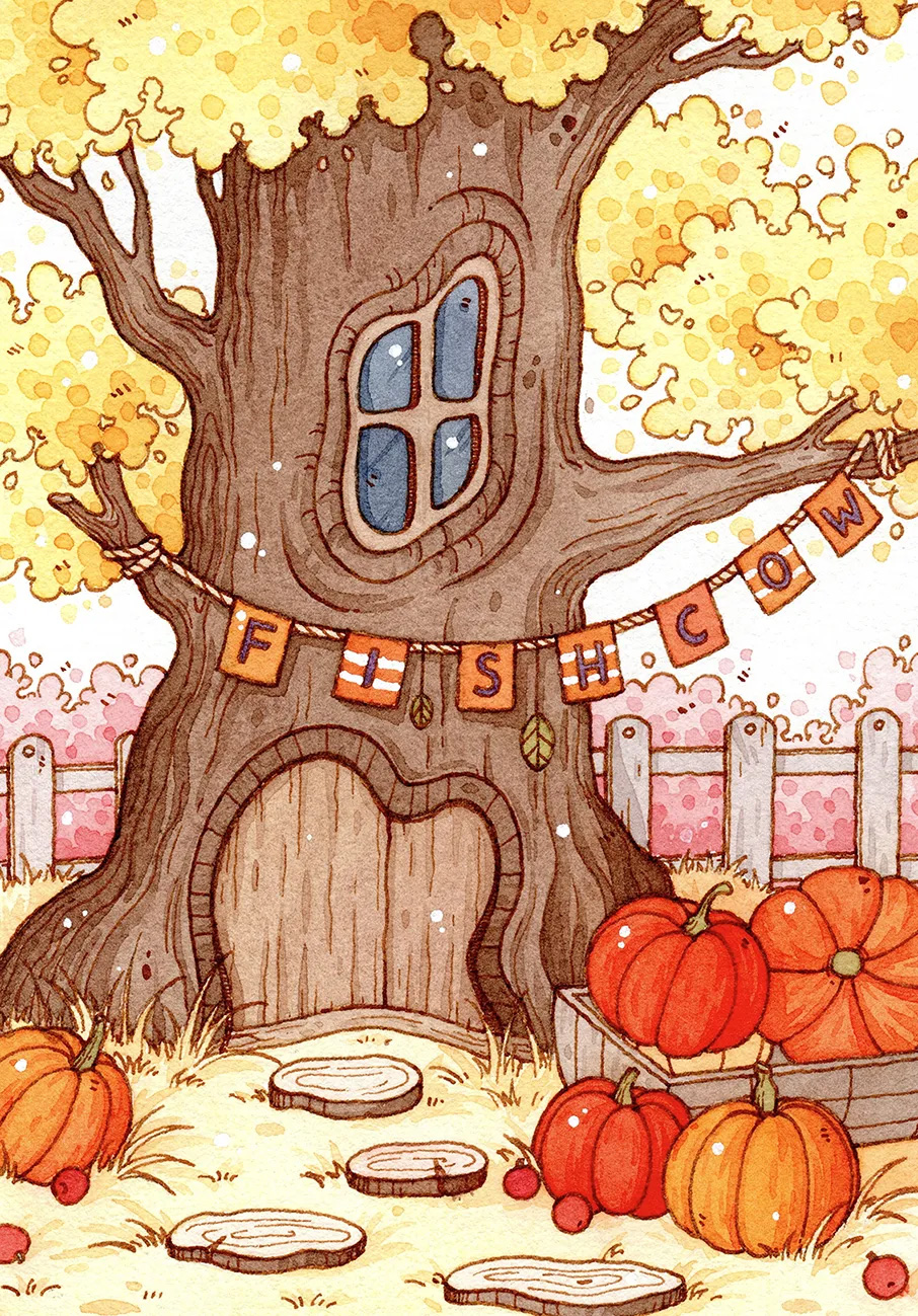 小時(shí)候,總覺得心里藏著整個(gè)童話世界,有小兔子才能住進(jìn)去的樹屋,有它的好朋友送給她的南瓜,堆滿了她的屋門口,還有黃色的樹和粉色的灌木叢。我們從沒想過這個(gè)童話世界是否與現(xiàn)實(shí)世界一致,只是單純地認(rèn)為這就是我們內(nèi)心的小世界。畫中畫出了我童年時(shí)對于童話世界的渴望。畫面的遠(yuǎn)景處有少許留白,為體現(xiàn)童年少許記憶的缺失和對美好未來的無限遐想。