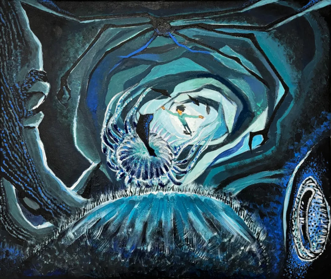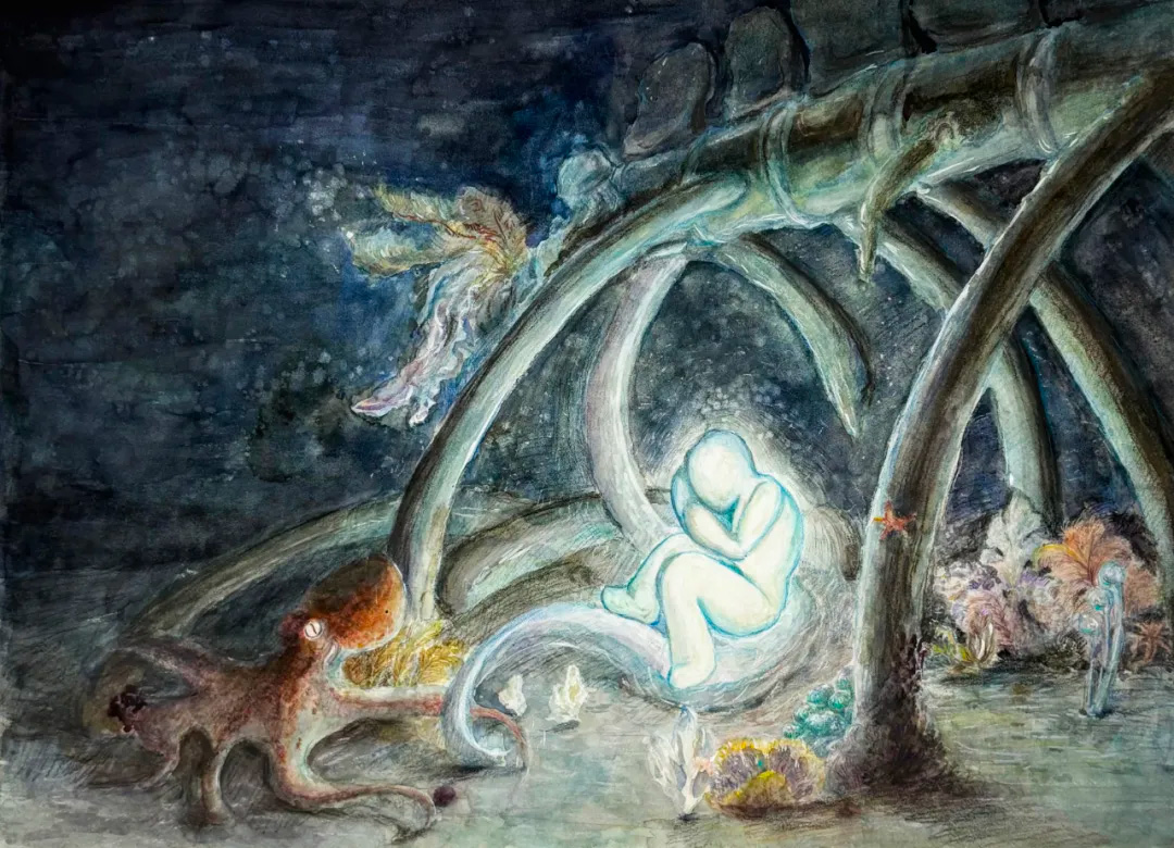 在我的理解中,人類和海洋生物是相似的。我們都有一個(gè)共同的祖先——海洋,但不同的生存需求和環(huán)境因素迫使我們以不同的方式進(jìn)化。為了回答“隱藏的深海奇跡”這一主題,我想回到生命起源的深海,創(chuàng)造屬于我自己的生態(tài)系統(tǒng)。在我的作品中,一個(gè)代表人類的人物生長在海底。鯨魚的骨頭中包含著隨著角色一起成長的小生物。我想表達(dá)的是:鯨魚墜落,滋養(yǎng)小生物,深海孕育人類。