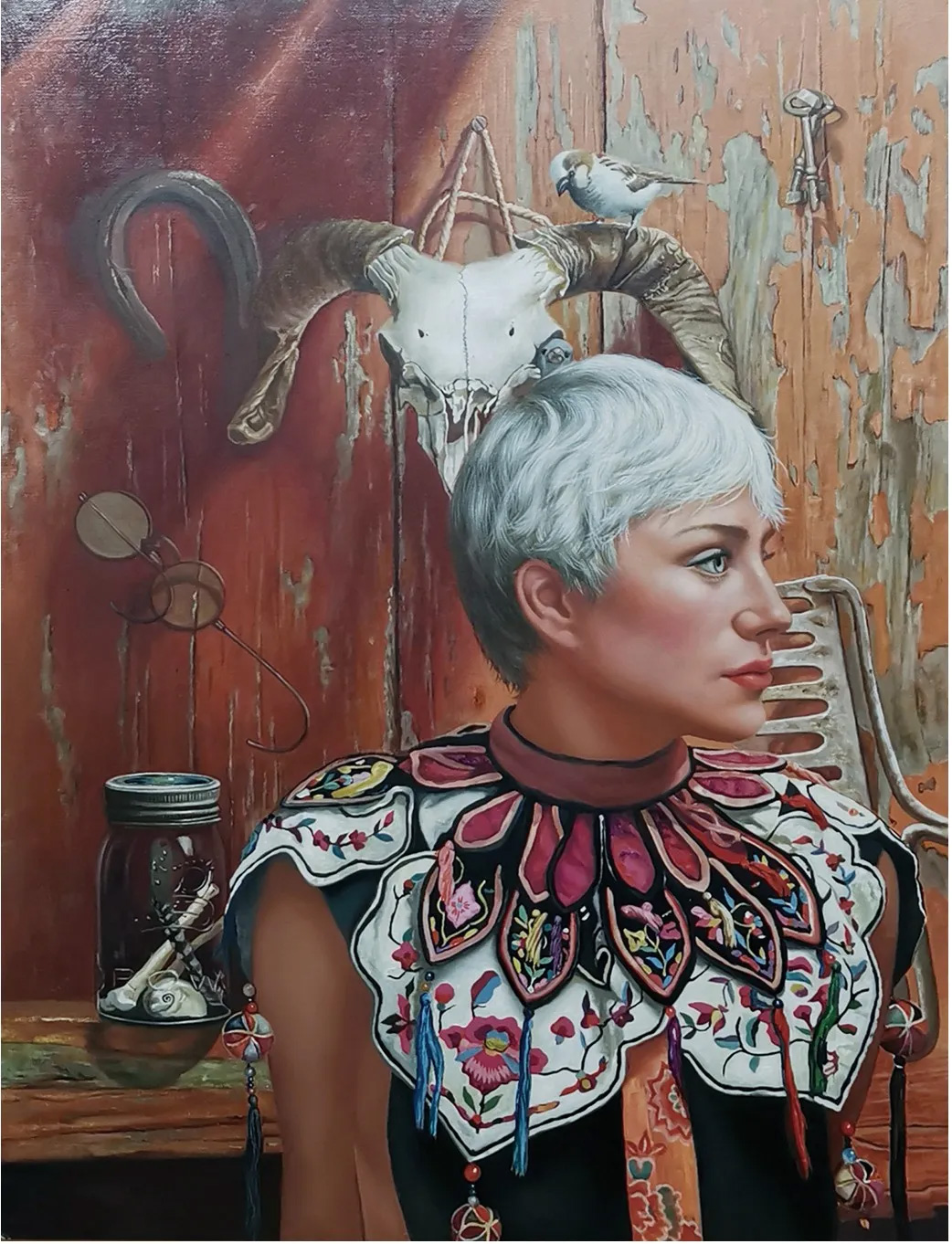 云肩也叫披肩,中國古代置于肩部的裝飾織物。云肩最初只是用以保護(hù)領(lǐng)口和肩部的清潔,后逐漸演變?yōu)橐环N裝飾物,多以彩錦繡制而成,曄如雨后云霞映日,晴空散彩虹。云肩是中華民族服飾文化中歷史悠久的服飾款式,是一種獨(dú)特的服飾款式,裝飾圖案內(nèi)涵豐富,符號(hào)的藝術(shù)語言,數(shù)字的喻意,文化底蘊(yùn)哲理深邃。屬于中國本土的衣物裝飾被法國女性佩戴之后產(chǎn)生了一種別樣的美感,時(shí)尚——就是沖突和混搭出富有個(gè)性的重新定義。而不是價(jià)格昂貴的奢侈品加持。這幅畫中女性是偶爾遇見的街拍,她大膽的將中國原產(chǎn)的云肩隨意的搭在T恤之上,這樣的裝飾物,在時(shí)下的中國只有在戲劇舞臺(tái)上才能看見,對于她而言,大概她也只是覺得足夠漂亮就隨意穿在身上,我震撼她對美麗的理解,我也對時(shí)尚和個(gè)性的理解多了一份認(rèn)知,一瞬間被她的美折服。決定為這張照片畫上一張創(chuàng)作。關(guān)于背景處理——橘色的破舊門板和人間生命跡象的疊加,我只想讓觀眾看見關(guān)于歲月,關(guān)于生命,關(guān)于陽光——是女性給與這個(gè)世界最溫暖的啟示。毫無疑問女性值得被書寫被刻畫,她們是這個(gè)人間最值得被贊美的被造物。